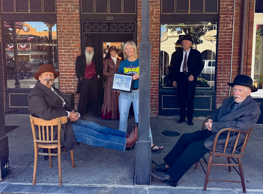 Prior to the farewell surprise party, Mark and Ken teamed with the Historic District and Folsom Times to “recreate” the historical photo of the landmark building, complete with era themed costumes. The remake of the photo was presented to the father and son at the farewell gathering for a keepsake.