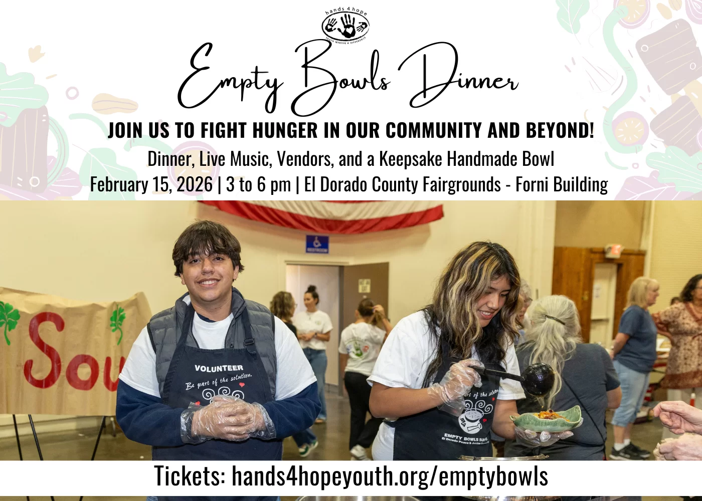 Join us for a fundraiser dinner to fight hunger in our community and beyond! Local youth-led nonprofit Hands4Hope – Youth Making A Difference will be hosting the annual Empty Bowls Dinner on Sunday, February 15, 2026 at the Forni Building, El Dorado County Fairgrounds in Placerville, from 3 to 6 pm. This family-friendly event includes live music, vendors, a dinner featuring delicious soups and fresh breads, and a keepsake handmade bowl to take home as a reminder of the cause. Tickets are $25 presale, $15 ages 5-18, 4 & under free. Tickets available at the door. Tickets and info available at: https://www.hands4hopeyouth.org/emptybowls