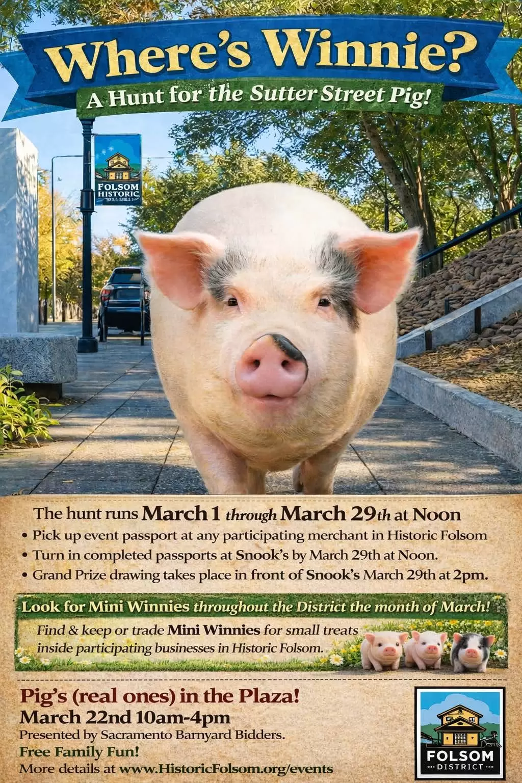 Where’s Winnie? Historic Folsom March 1–29 with three fun activities in one! Pick up a passport at participating businesses and search for Winnie the Pig inside nearly 30 local shops, hunt for hidden mini Winnies throughout the district, and enjoy Pigs in the Plaza. Collect signatures, earn treats, and complete your passport for a chance to win prizes. It’s a free, family-friendly adventure all month long!