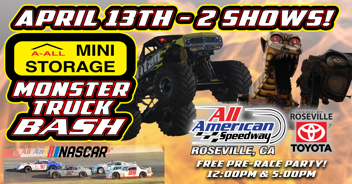 Apr 13 All Day A-All Mini Storage Spring Monster Truck Bash all american speedway 800 Event Center Drive, Roseville Event Details Get Directions