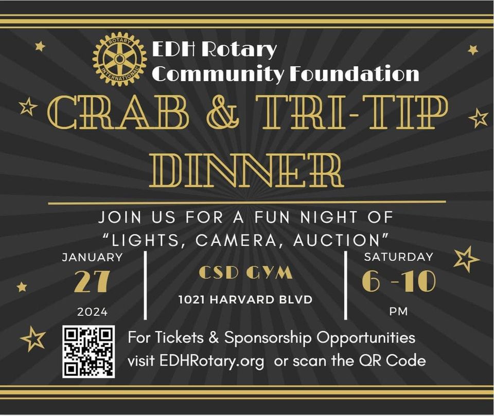 Jan 27 6:00 pm - 10:00 pm Rotary Club of El Dorado Hills Crab & Tri-Tip Feed EDH Community Services District 1021 Harvard Way, El Dorado Hills Event Details Get Directions