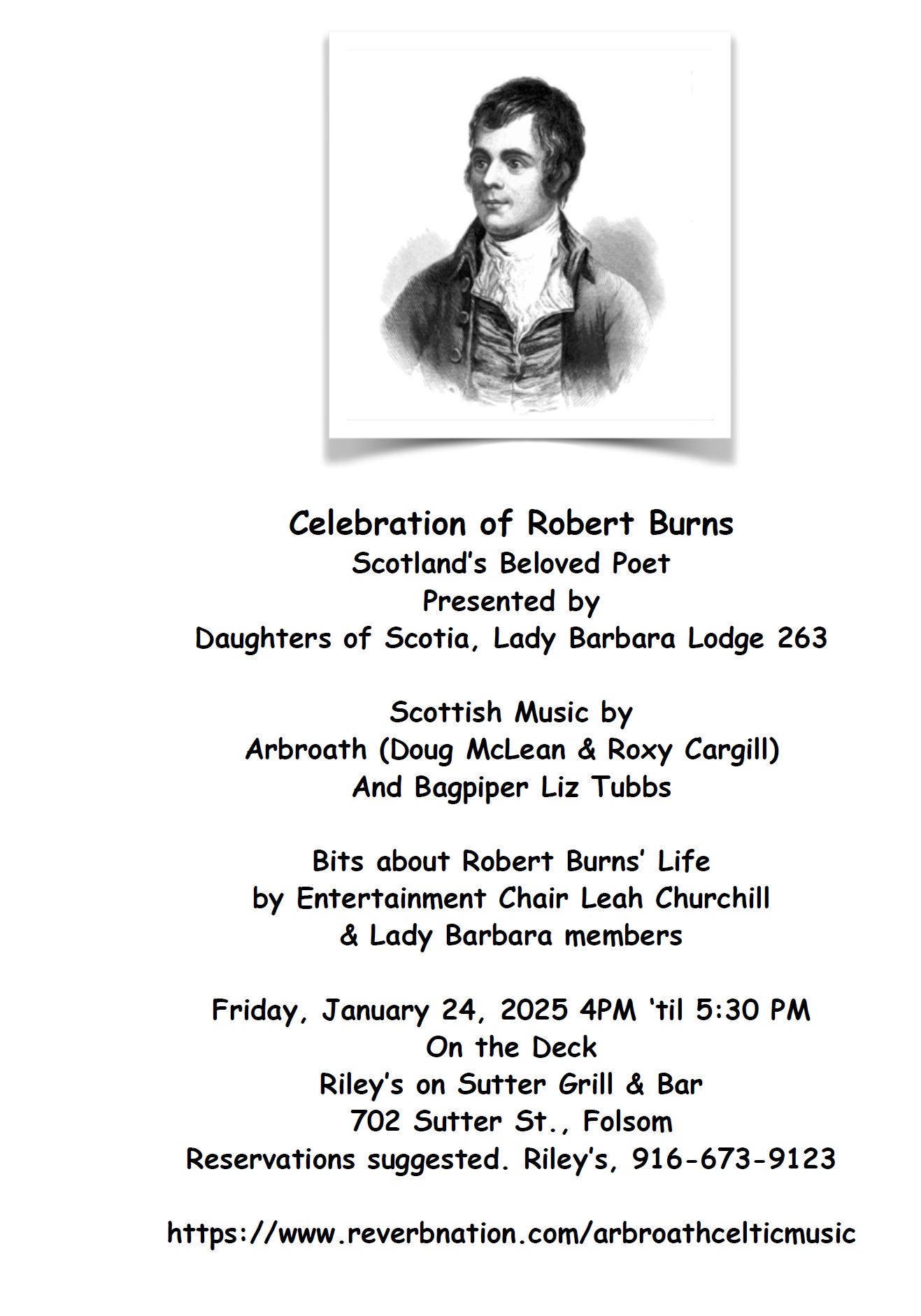 Jan 24 4:00 pm - 5:30 pm Robert Burns Celebration–Riley’s on Sutter Grill & Bar, Feb. 24. 4-5:30PM Rileys on Sutter Grill and Bar 702 Sutter St, Folsom Event Details Get Directions