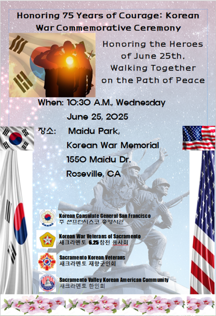 Jun 25 10:30 am - 11:30 am Invitation to the 75th Anniversary Korean War Commemoration Ceremony 1550 1550 Maidu Drive, roseville Event Details Get Directions