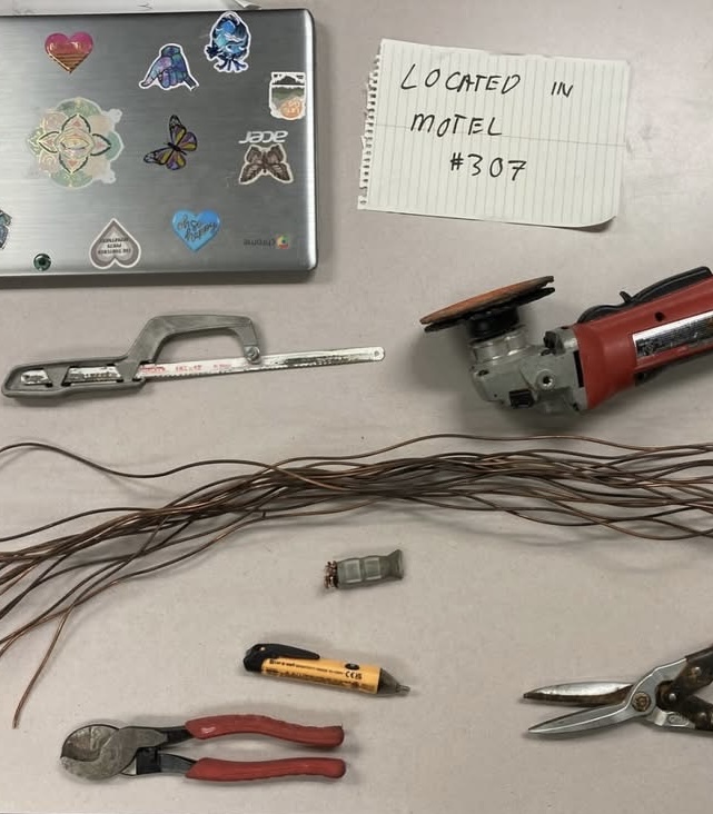 Investigators said multiple poles along the route had been damaged as a result of the wire removal. Deputies recovered approximately two pounds of stolen copper wire at the scene, along with additional burglary tools later found inside Jones’ hotel room.