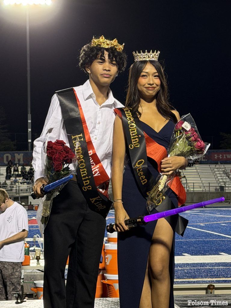 The packed home crowd cheered as seniors Travis Sky Gama and Noutrie Mounlaphasith were crowned during the halftime ceremony, continuing one of Folsom High’s most cherished homecoming traditions. The pair received a warm ovation from classmates, families, and alumni as the marching band played and the cheer squad filled the field in a vibrant halftime celebration that perfectly captured the spirit of Bulldog Nation.