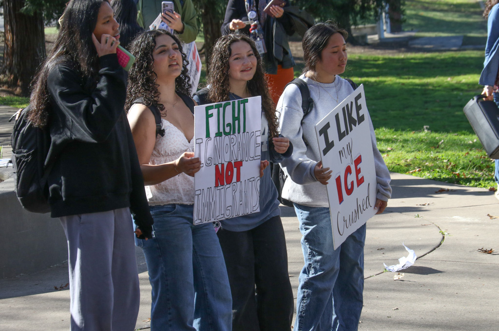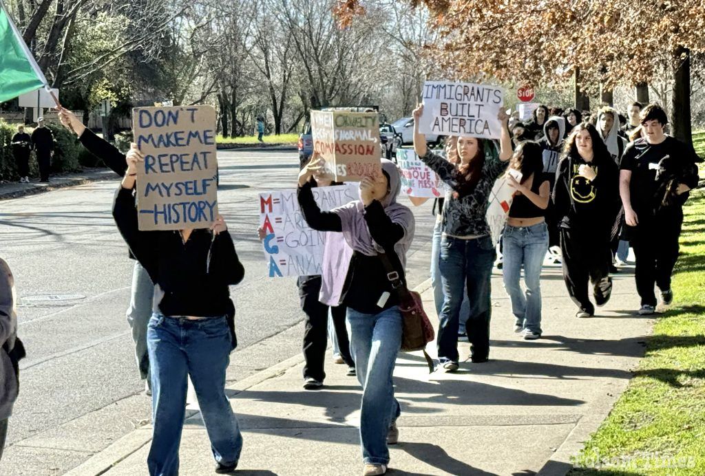 Groups of students from Folsom High School and Vista del Lago High School walked out of their classrooms Thursday morning in a coordinated, student-led demonstration, in what they cite as a protest against federal immigration policies, marching through city streets before gathering for a rally and art advocacy event at John Kemp Community Park.