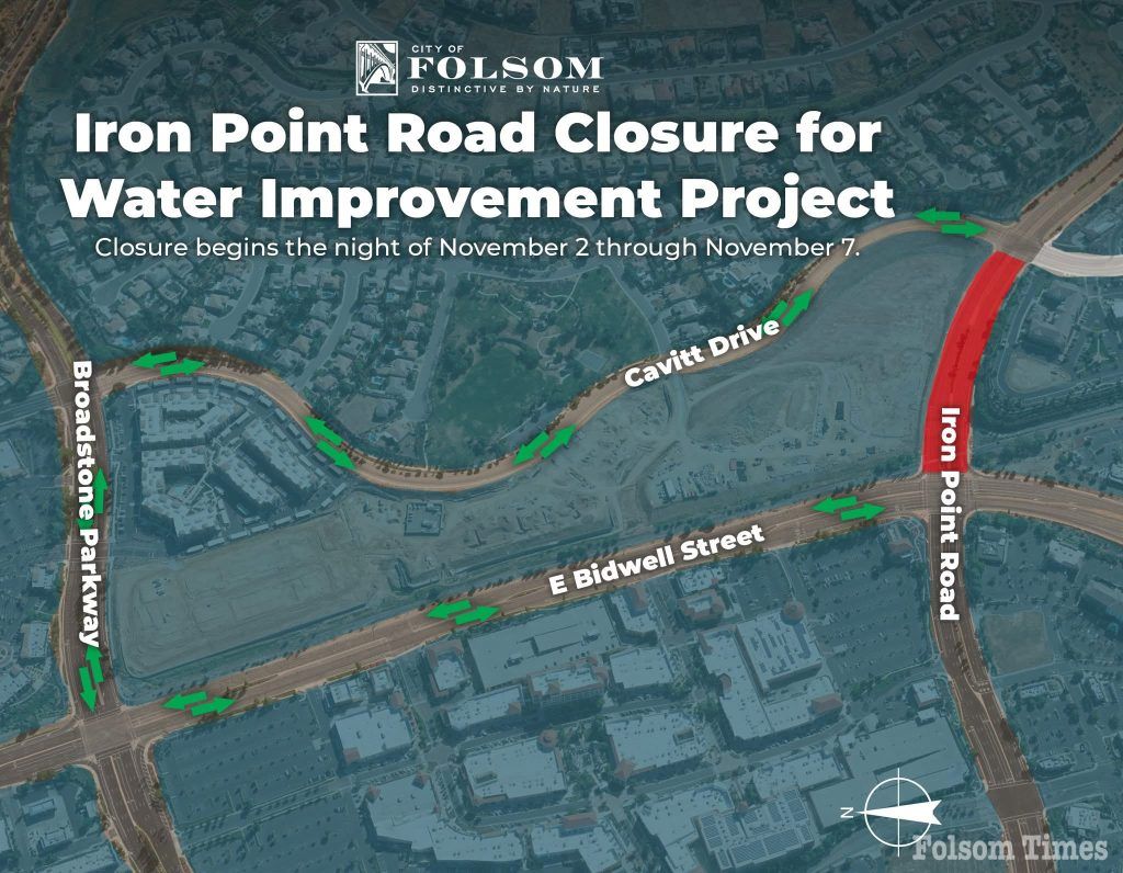 FOLSOM — Motorists traveling through one of Folsom’s busiest corridors will encounter a full road closure early next month as crews take on a key phase of the city’s ongoing Water Infrastructure Project. Iron Point Road will be closed between East Bidwell Street and Cavitt Drive from 9 p.m. on November 2 through November 7 while crews install a new section of water pipeline beneath the roadway.