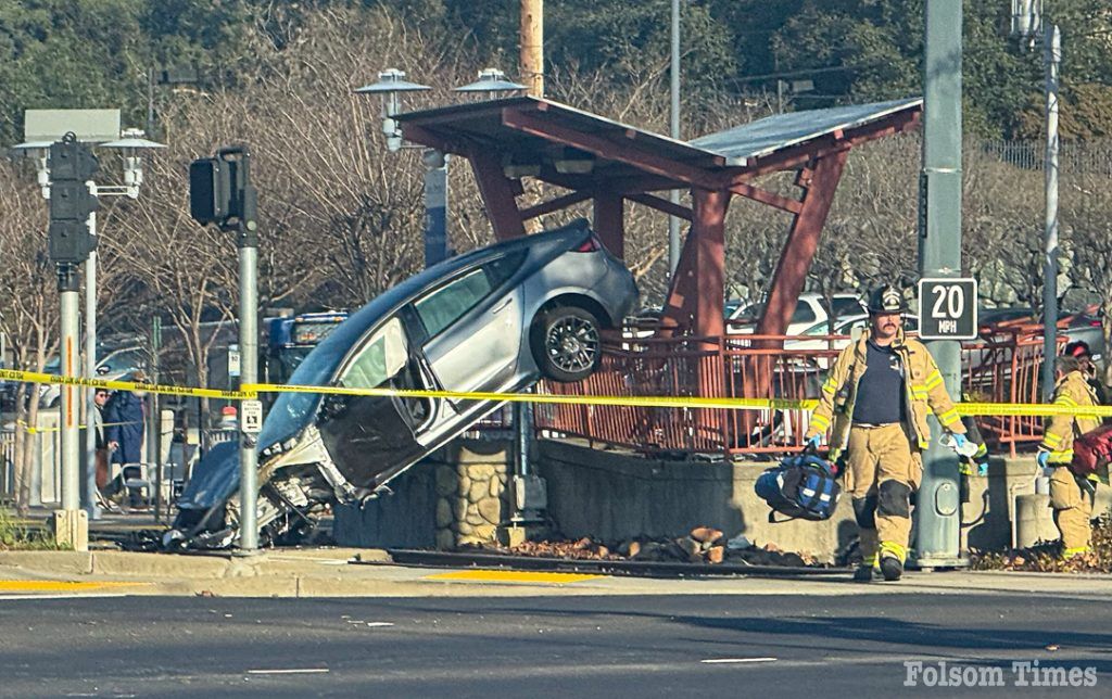 The incident was reported at 2:53 p.m. as multiple units from the Folsom Fire Department and Folsom Police were dispatched to the following multiple 911 calls reporting that a vehicle had left the roadway and struck the train access ramp Upon arrival to the scene firefighters were faced with a passenger vehicle that was precariously lodged onto the light ramp structure and at least two victims Light rail service through the area was immediately halted as personnel stabilized the scene.