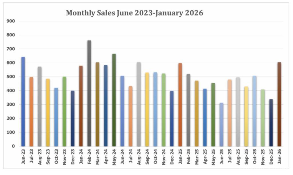 The monthly total was up 1% from last January’s 598 and tied August 2024 for the highest monthly sales volume since May 2024, when 666 homes sold.